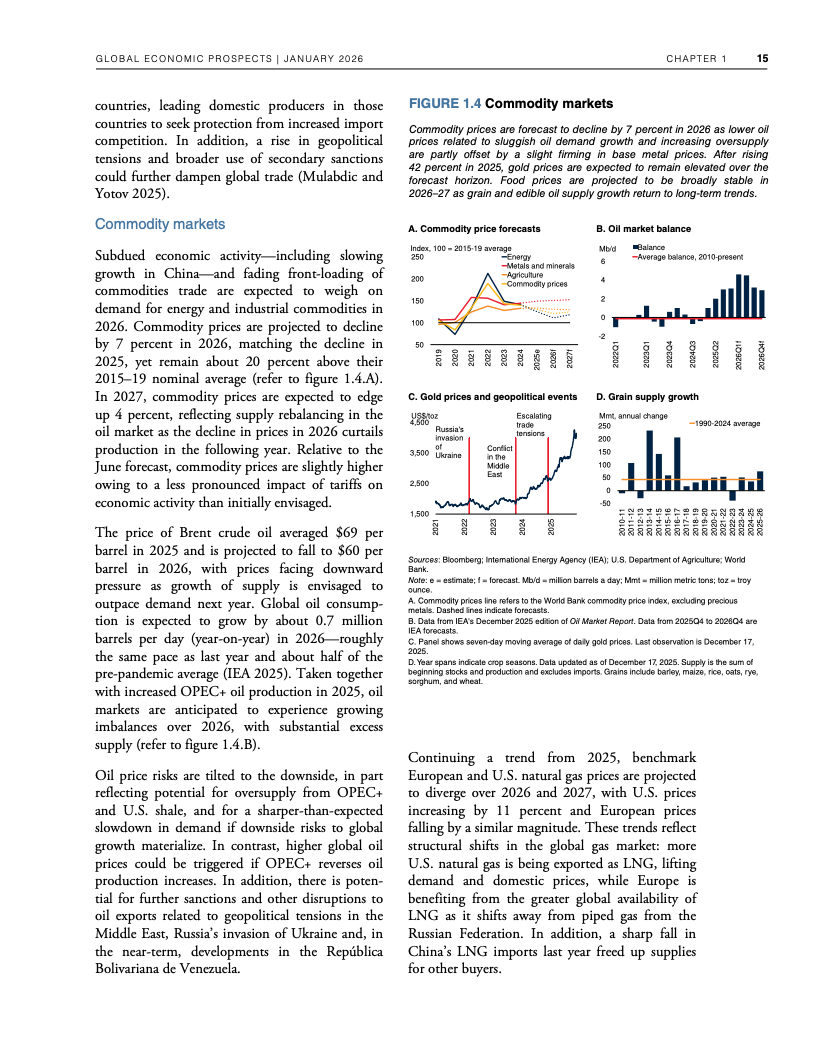 贸易与大宗商品呈现同步走弱态势。全球贸易量在2025年受“抢出口”效应支撑增长3.4%,2026年预计明显降温。能源需求放缓叠加OPEC+增产,使油价预测从2025年的每桶69美元降至2026年的60美元,通胀回落趋势得以延续,但不同经济体间分化加剧 。