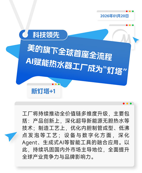 1月16日,美的厨热芜湖工厂(简称“厨热芜湖”)成功入选世界经济论坛(WEF)发布的最新一批“全球灯塔工厂”,成为美的集团旗下第八家灯塔工厂,这也意味着全球首座全流程AI赋能热水器工厂、芜湖市首家灯塔工厂诞生!该荣誉不仅彰显了厨热芜湖在智能制造领域的全球领先地位,也标志着美的集团在数字化、智能化方面的能力再次获得国际权威认可。