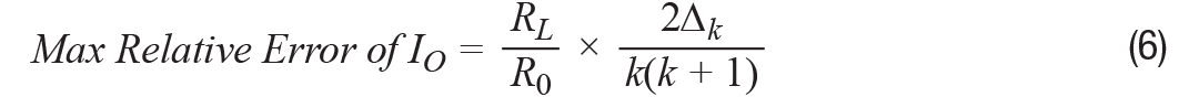 考虑R1/R2和R3/R4的不匹配,RL将会影响输出失调电流。最差相对误差如公式6所示。这个误差取决于RL/R0和k。减小负载电阻并提高k将减少失调误差。