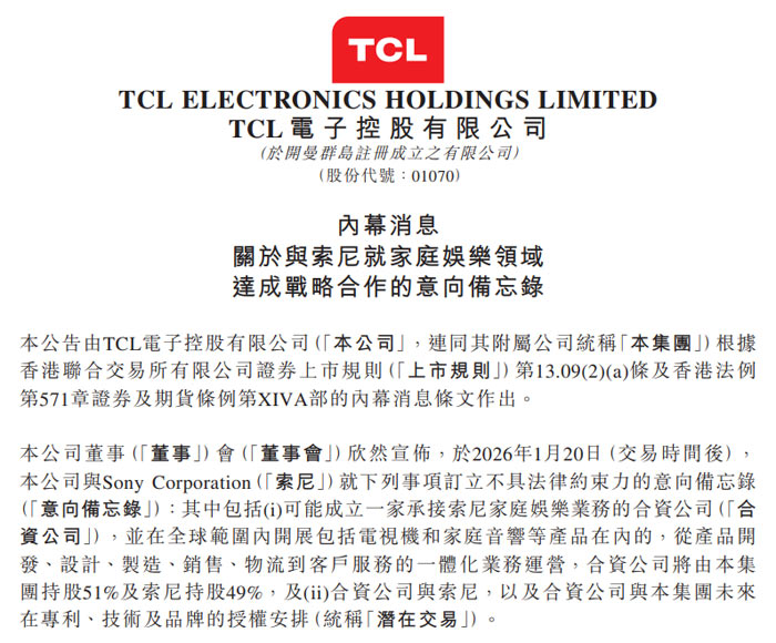 2026 年 1 月 20 日,TCL 电子控股有限公司(以下简称 “TCL 电子”,股份代号:01070,于开曼群岛注册成立)发布内幕消息公告,宣布公司于当日交易时间后与 Sony Corporation(以下简称 “索尼”)签订不具法律约束力的意向备忘录,就家庭娱乐领域战略合作达成初步共识,拟共同推进包括合资公司设立、技术品牌授权在内的潜在交易。
