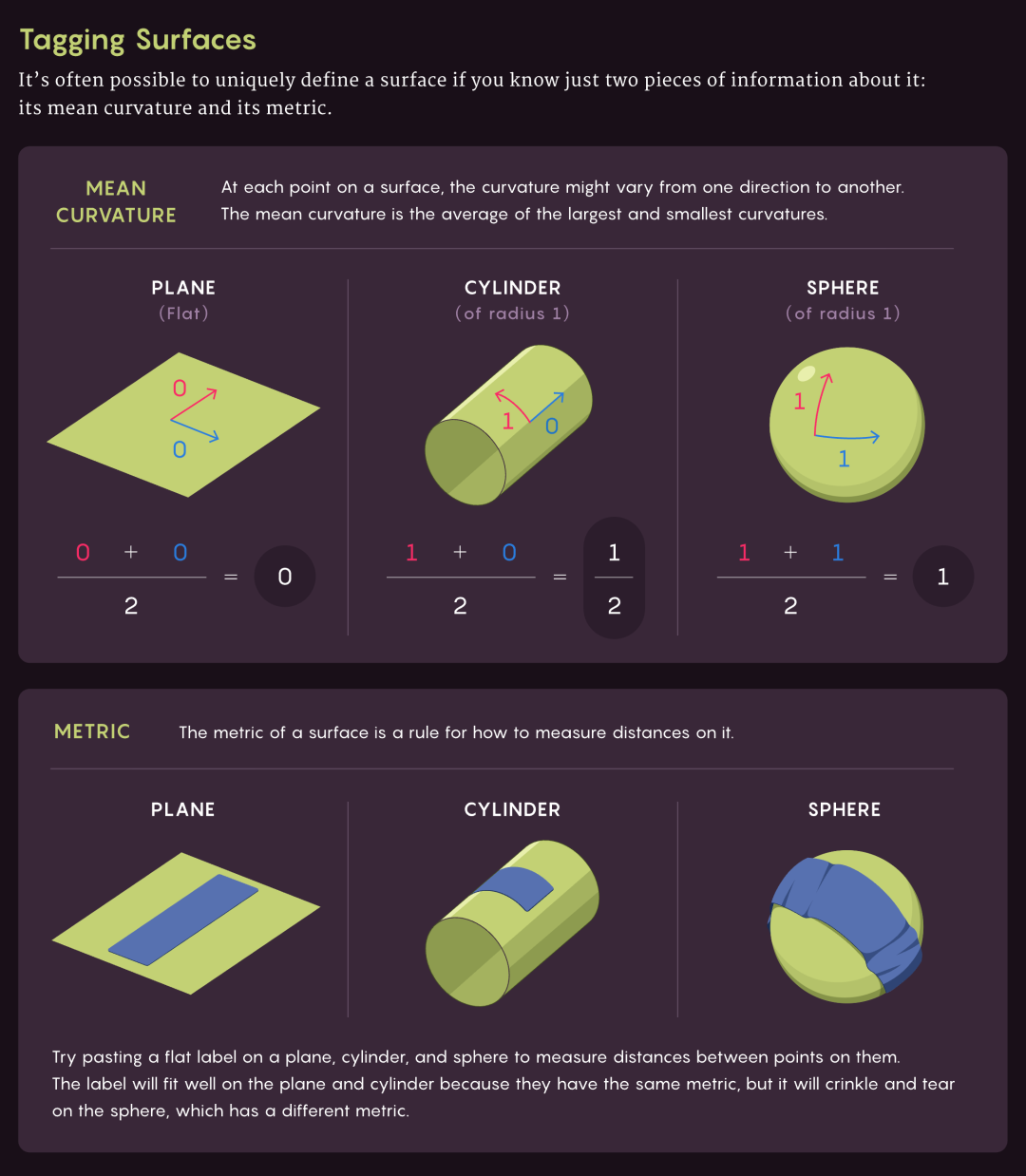 其中一种方法捕捉的是关于曲面「外在」曲率的信息,即在曲面上任选一点,你可以沿着无限多的方向计算曲面在空间中的弯曲程度,也就是所谓的曲率。只关注那些能得到最大和最小曲率值的方向,然后取这两个值的平均数,得到的数值被称为「平均曲率」。你可以计算曲面上任意给定点的平均曲率,从而更好地理解它是如何置于周围空间之中的。