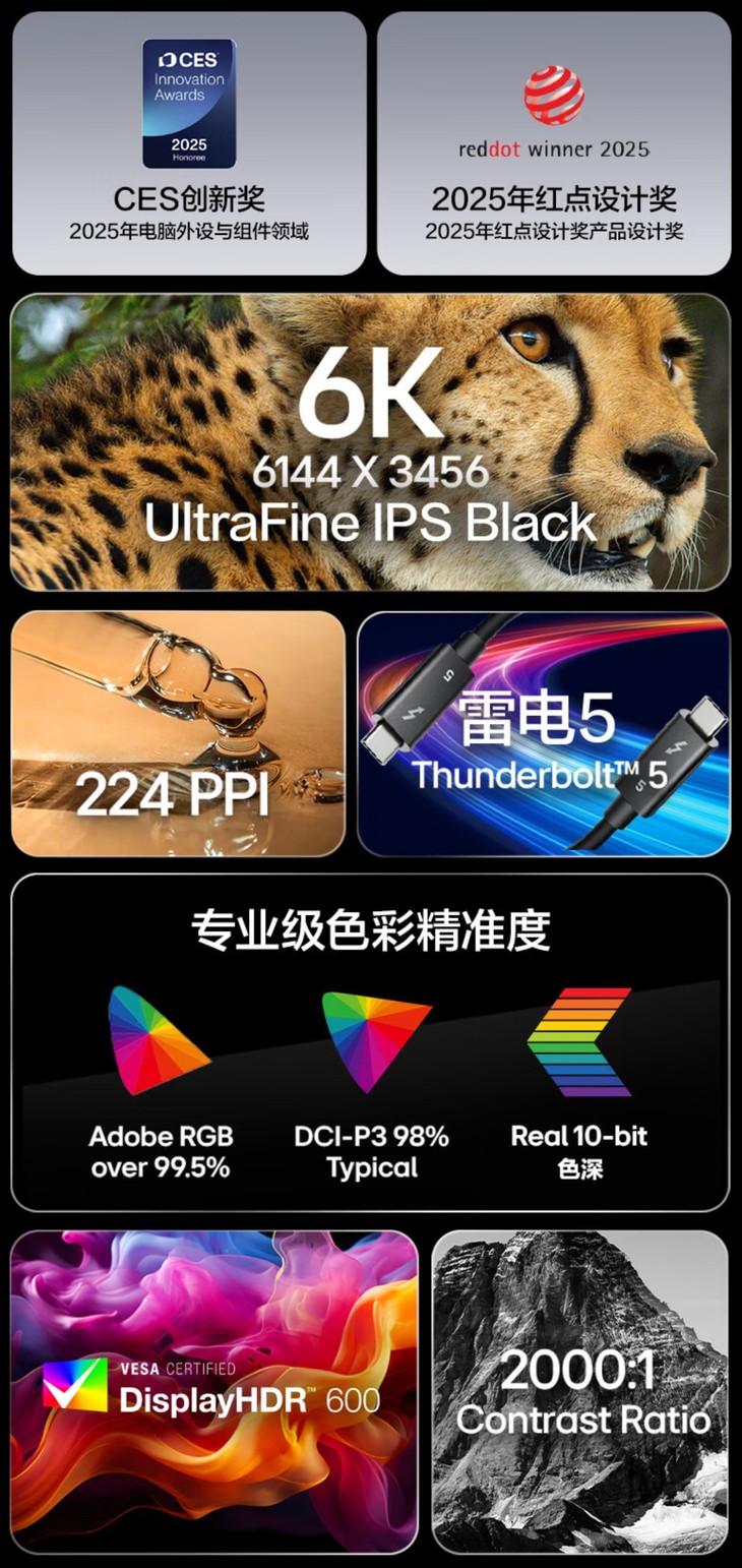 这款31.5英寸显示器延续了极简美学风格,采用金属材质打造纤薄几何机身,四面近乎无边框的设计拓宽了视觉视野。其核心显示配置为Nano IPS Black面板,拥有6144×3456的6K HiDPI分辨率,224PPI像素密度带来细腻画面;原生10bit色深、98% DCI-P3色域与99.5% Adobe RGB色域覆盖,搭配2000:1典型对比度与VESA DisplayHDR 600认证,为专业创作提供精准色彩还原。出厂前的专业校准更确保了与macOS的色彩同步,针对Mac设备推出的工作室模式,进一步优化了苹果生态用户的创作体验。