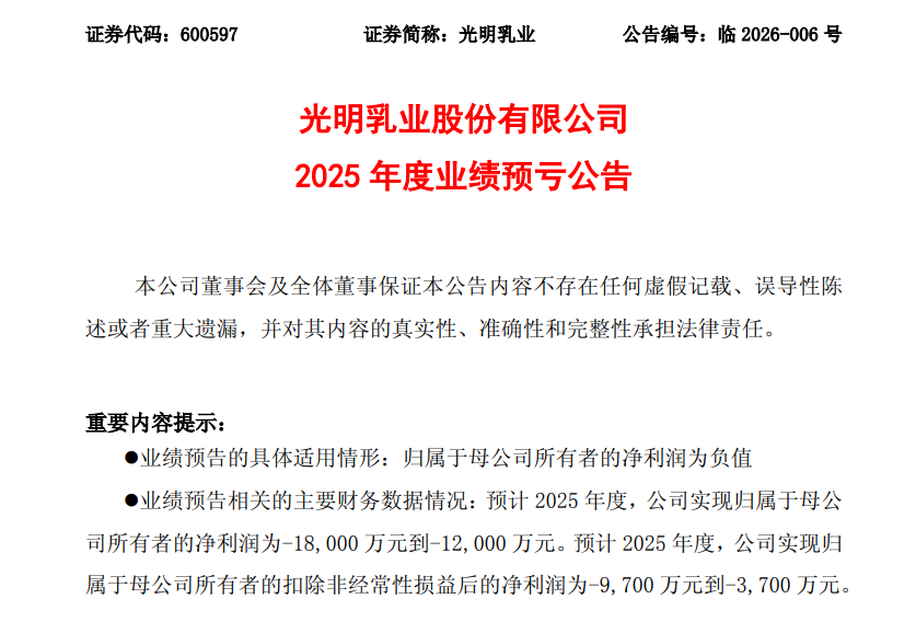 1月20日,光明乳业(600597.SH)发布了2025年度业绩预亏公告。公告显示,预计2025年度公司实现归属于母公司所有者的净利润为-18,000万元至-12,000万元,与上年同期相比将出现亏损。同时,预计2025年度公司实现归属于母公司所有者的扣除非经常性损益后的净利润为-9,700万元至-3,700万元。
