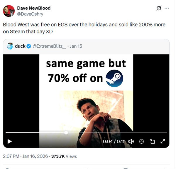 近日,发行商New Blood总裁Dave Oshry表示,独立游戏《Blood West(浴血西部)》在Epic平台免费赠送当天,Steam版本销量暴涨约200%。
