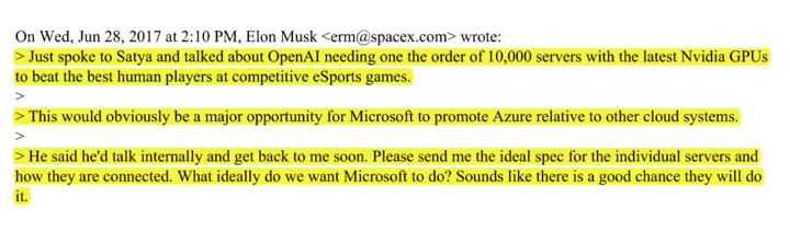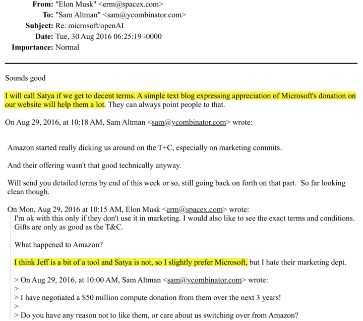 2016 年,奥特曼问马斯克,要不要从亚马逊换到微软云?马斯克当时正看亚马逊的贝索斯不顺眼。他在邮件里回复说:「我觉得贝索斯像个傻瓜,纳德拉不是,所以我倾向微软。」