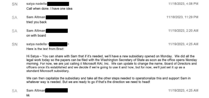 最新曝光的短信实锤了这一点。就在那个周六,微软一方面利用媒体施压 OpenAI 董事会,另一方面私下火速注册了一家名为 Microsoft RAI Inc. 的新子公司(RAI 代表「负责任的人工智能」)。