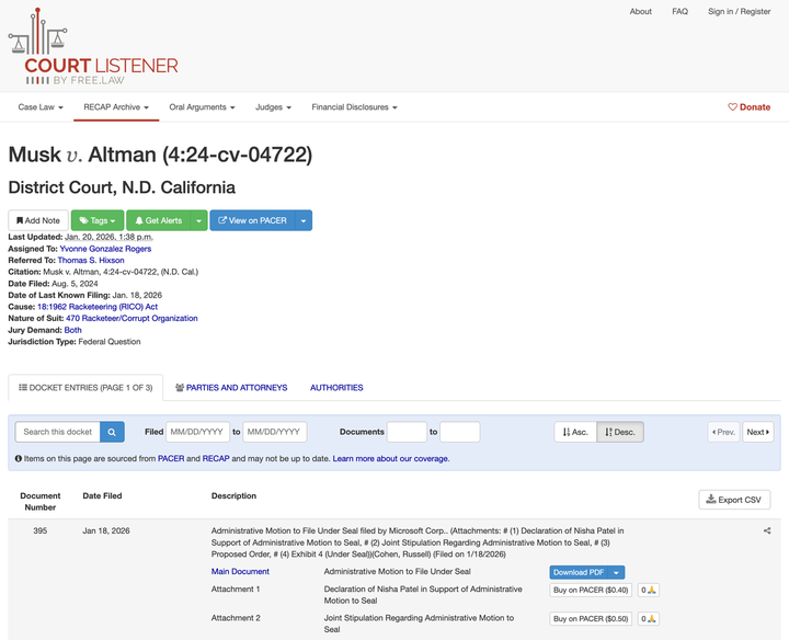 ▲档案地址:https://www.courtlistener.com/docket/69013420/musk-v-altman/?order_by=desc