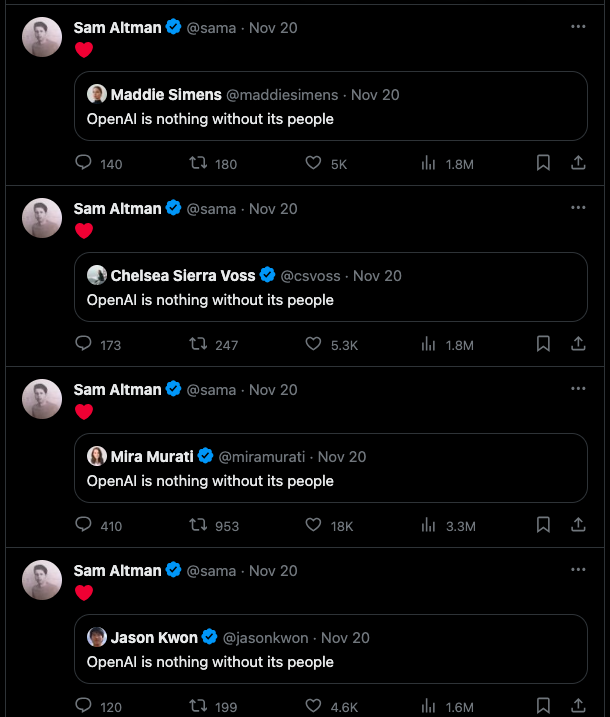 后面的故事大家都知道了,一大群 OpenAI 的员工纷纷联系奥特曼和 OpenAI 总裁格雷格·布罗克曼,表达对他们的忠诚,并在 X 等公开平台统一发出同一句话:「OpenAI Is Nothing Without Its People(没有员工,OpenAI 什么都不是。)」