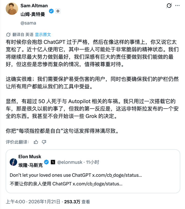 对此,奥特曼很快作出回应,顺带还将矛头对准了马斯克旗下的特斯拉和 xAI 旗下的聊天机器人 Grok,并嘲讽后者最近因生成不雅图正被各国监管围剿。