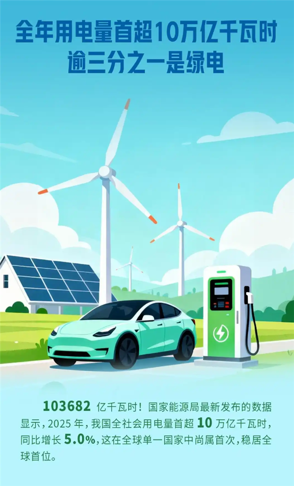 2025年,全社会用电量累计103682亿千瓦时,同比增长5.0%。