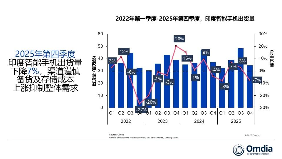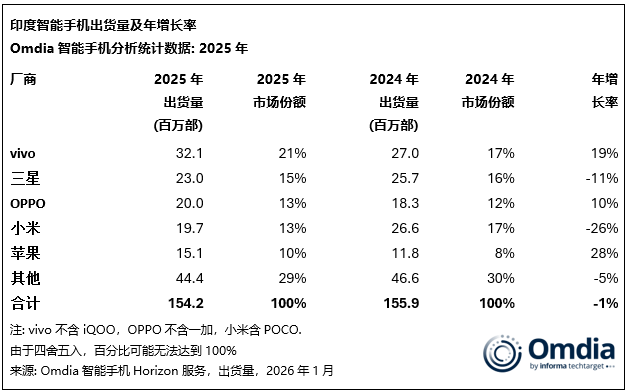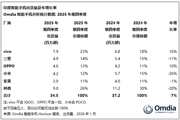 Omdia最新研究显示,2025年第四季度,印度智能手机出货量同比下降7%,至3450万部。这一表现反映了节后需求通常放缓的趋势,同时受渠道库存高企、卢比贬值以及受存储成本上涨推动的价格上调影响,中低端市场购买力减弱。vivo在该季度继续保持领先地位,出货790万部,市场份额23%,稳居第四季度及全年2025年的榜首。三星以490万部、14%份额位列第二。OPPO(不含一加)以460万部、13%份额超过小米跻身第三。小米与苹果分别出货420万部和390万部。