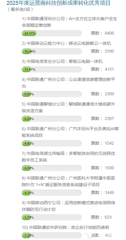 日前,由运营商财经网举办的一年一度财经TMT“领袖榜”评选活动,投票通道已经开启。下面对“2025年度运营商科技创新成果转化优秀项目”奖项的投票情况,进行发布。
