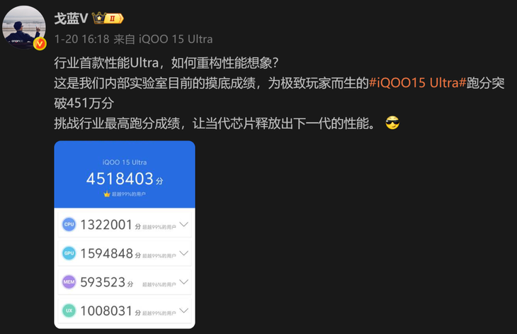 性能方面,此前,iQOO产品经理戈蓝晒出了iQOO 15 Ultra的跑分成绩,达到惊人的451万分,打破了行业最高。他透露,这个分数并非新机的终极表现,新机将搭载高通第五代骁龙8至尊版旗舰芯片,并内置主动散热风扇,以确保性能得到充分释放。