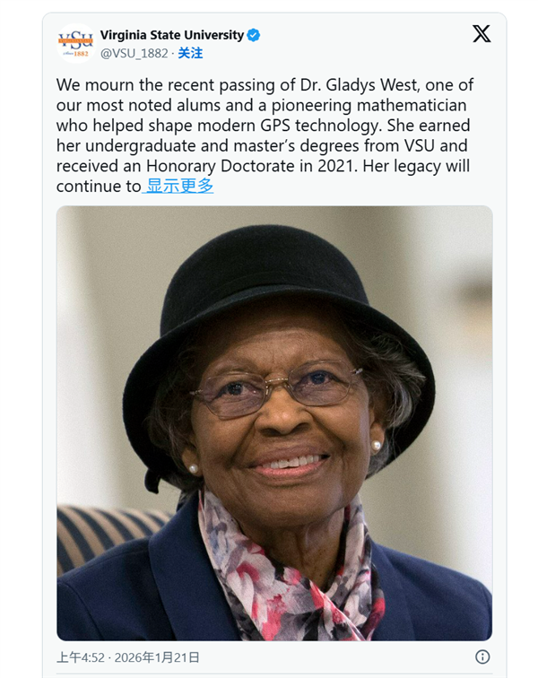 “她是一位开拓者,其卓越才华对现代GPS技术的发展做出杰出贡献。她追求卓越、勇于创新、乐于奉献的精神将永远激励维吉尼亚州立大学全体师生。”维吉尼亚州立大学20日也在社群平台X发文,悼念韦斯特。
