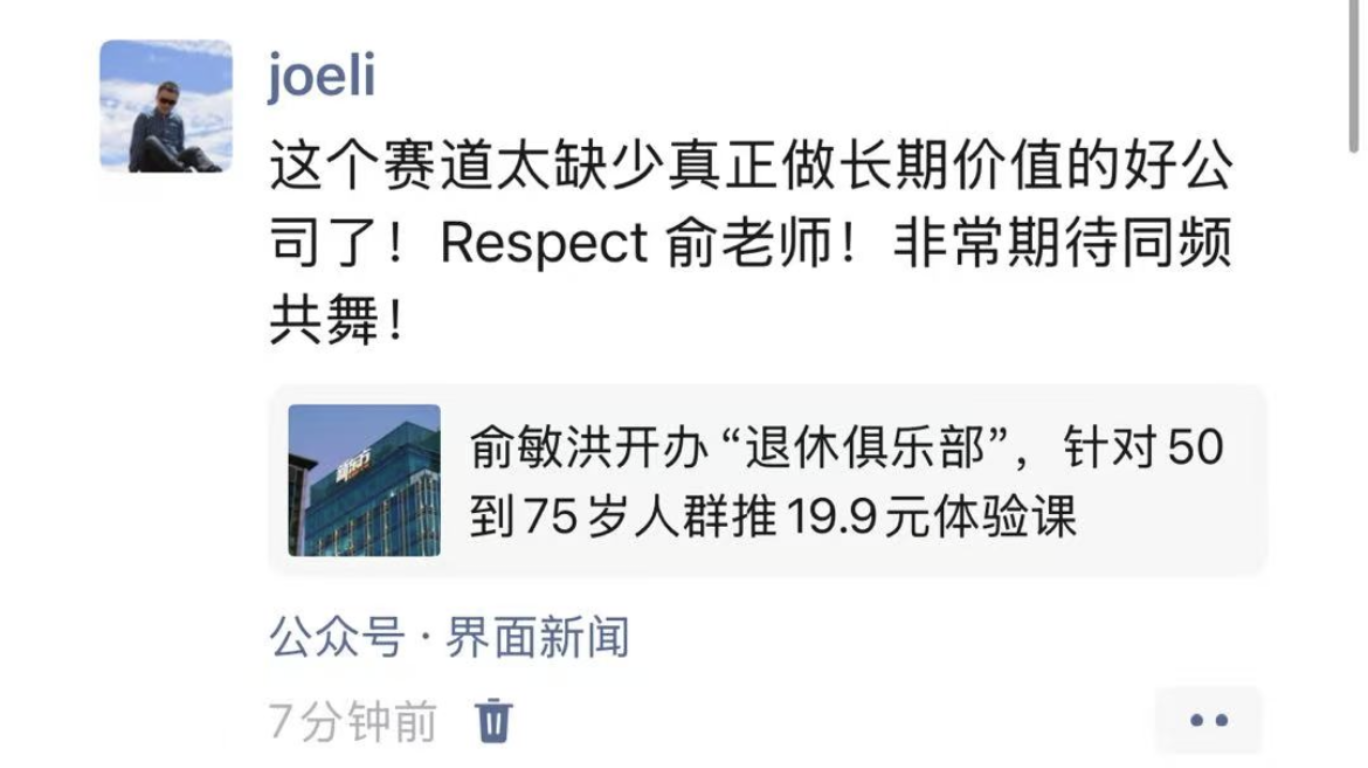 1月21日,中国银发文娱赛道企业红松创始人、CEO李乔表示,欢迎新东方加入银发文娱赛道,红松社区愿意向新东方开放所有社区资源。