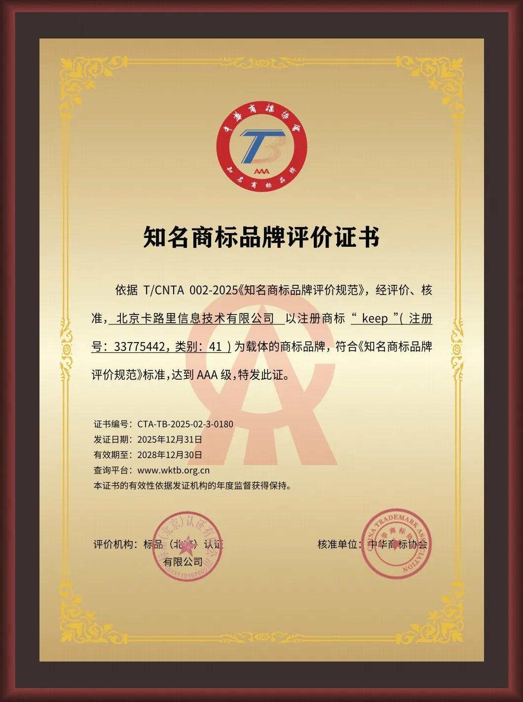 2025年12月31日,Keep荣获中华商标协会颁发的AAA知名商标品牌评价证书,成为运动科技行业首个获评该荣誉的商标品牌。