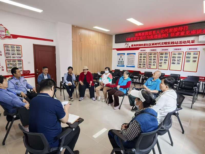 2025年5月15日,大兴区瀛海镇南海家园四里社区人大代表联络站组织开展《北京市文明行为促进条例》及相关法律法规实施情况征求意见建议座谈会。市人大常委会供图