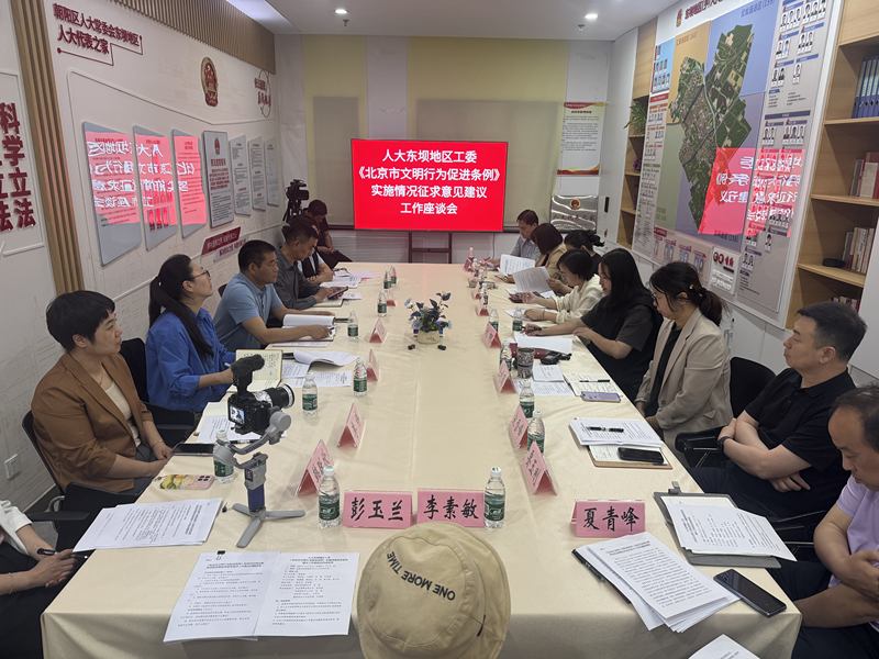 2025年5月22日,朝阳区东坝人大工委在红映坊党群服务中心人大代表之家组织开展《北京市文明行为促进条例》及相关法律法规实施情况征求意见建议座谈会。市人大常委会供图