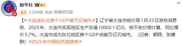 据新华社微博消息,辽宁省大连市统计局1月23日发布消息称,2025年,大连市实现地区生产总值10002.1亿元,按不变价格计算,同比增长5.7%。大连市成为东北地区首个GDP突破万亿元城市。(记者:郭翔、张博群)