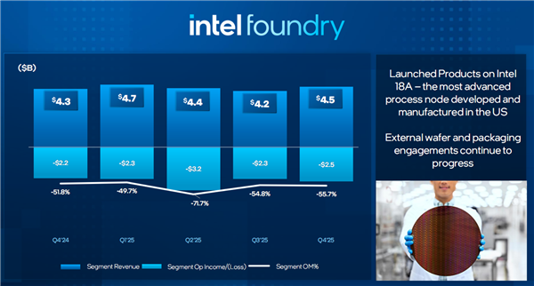 Intel Foundry代工业务四季度收入45亿美元,同比增加4%,去年收入1789亿美元,同比增加3%。