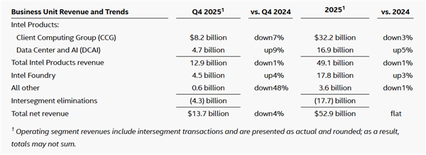 按照业务划分,CCG客户端事业部四季度收入82亿美元,同比下滑7%,全年收入322亿美元,同比下滑3%。