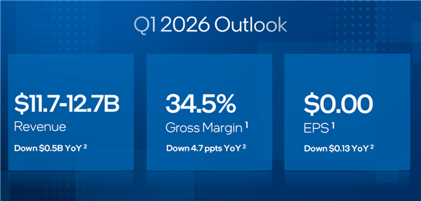 Intel预计2026年第一季度收入122±5亿美元,毛利率32.3%,每股亏损0.21美元。