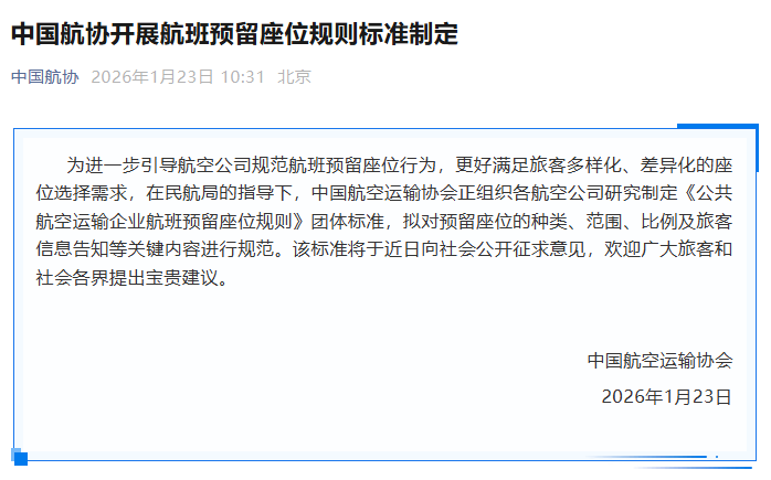 新京报讯 据中国航协微信公众号消息,为进一步引导航空公司规范航班预留座位行为,更好满足旅客多样化、差异化的座位选择需求,在民航局的指导下,中国航空运输协会正组织各航空公司研究制定《公共航空运输企业航班预留座位规则》团体标准,拟对预留座位的种类、范围、比例及旅客信息告知等关键内容进行规范。该标准将于近日向社会公开征求意见,欢迎广大旅客和社会各界提出宝贵建议。