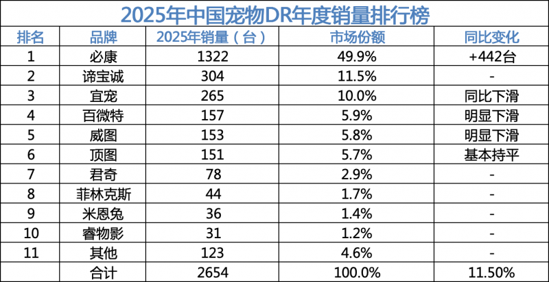 根据最新行业统计数据,2025年中国宠物专用数字化X射线摄影系统(DR)市场全年装机量排名正式确定。本年度市场总销量达到2,654台,同比增长11.5%,市场集中度进一步提升,头部品牌优势显著。