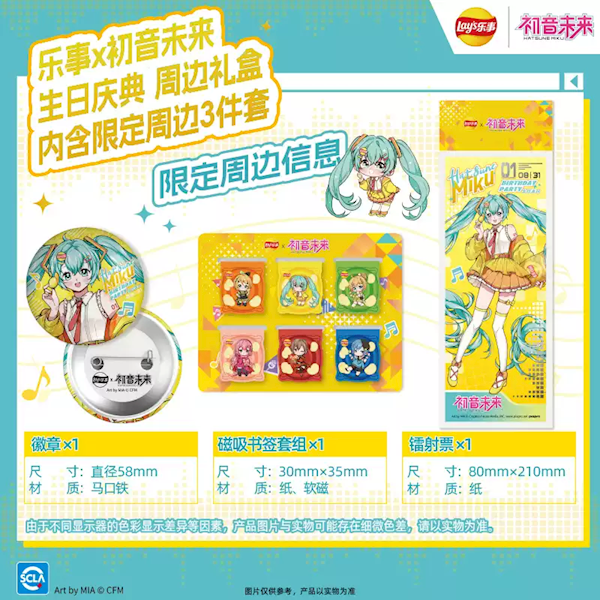 内含初音未来限定周边3件套,包含初音未来镭射票、初音未来徽章、初音未来磁吸书签套组各一个。
