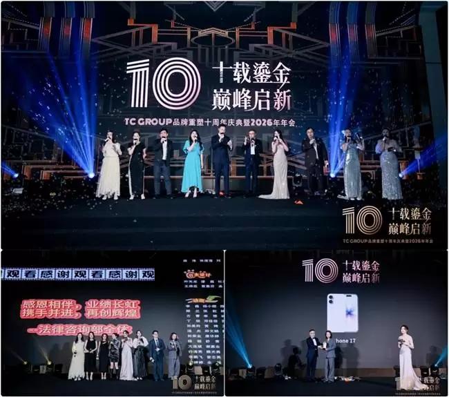 2026年1月18日,以“十载鎏金、巅峰启新”为主题的TC GROUP品牌重塑十周年庆典暨2026年会在欢腾与感动中隆重举行。来自TC GROUP美国、新加坡、中国香港、北京、上海、南京、苏州、无锡、成都、厦门、合肥等11个机构的杰出代表齐聚一堂,共同回顾奋斗历程,见证荣耀时刻,开启崭新征程。