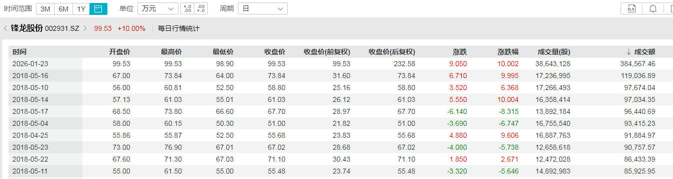 23日,锋龙股份放出巨量,成交金额高达38.46亿元,为上市以来新高,此前其成交金额最高不超过12亿元。