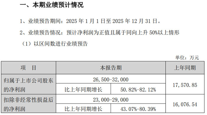 根据业绩预告,2025 年 1 月 1 日至 12 月 31 日期间,公司归属于上市公司股东的净利润预计为 26,500 万元至 32,000 万元,较上年同期的 17,570.85 万元增长 50.82%-82.12%;扣除非经常性损益后的净利润预计为 23,000 万元至 29,000 万元,较上年同期的 16,076.54 万元增长 43.07%-80.39%。