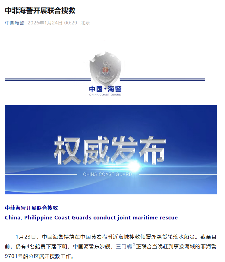 新京报讯 据中国海警微信公众号消息,1月23日,中国海警持续在中国黄岩岛附近海域搜救倾覆外籍货轮落水船员。截至目前,仍有4名船员下落不明,中国海警东沙舰、三门舰正联合当晚赶到事发海域的菲海警9701号船分区展开搜救工作。