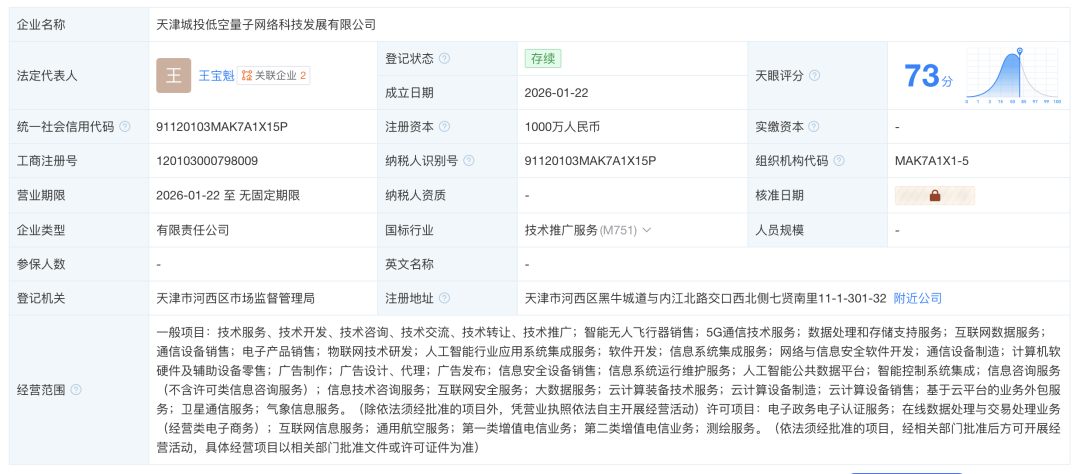 C114讯 1月26日消息(云青)据天眼查工商信息,2026年01月22日,天津城投低空量子网络科技发展有限公司成立。发起方为天津低空经济投资发展有限公司(持股51%)和中国电信全资子公司——中电信无人科技(江苏)有限公司(持股49%)。法定代表人为王宝魁,注册资本为1000万元。