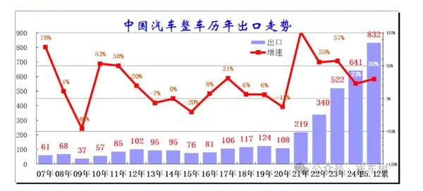 据乘联会秘书长崔东树消息,2025年12月,中国汽车出口成绩亮眼,达99万辆,同比增长73%,环比增长23%,全年出口总量达832万辆,较2024年增长30%。其中,新能源汽车表现尤为突出,12月出口42万辆,同比增长174%;全年出口343万辆,同比增长70%,增速远超2024年的16%。