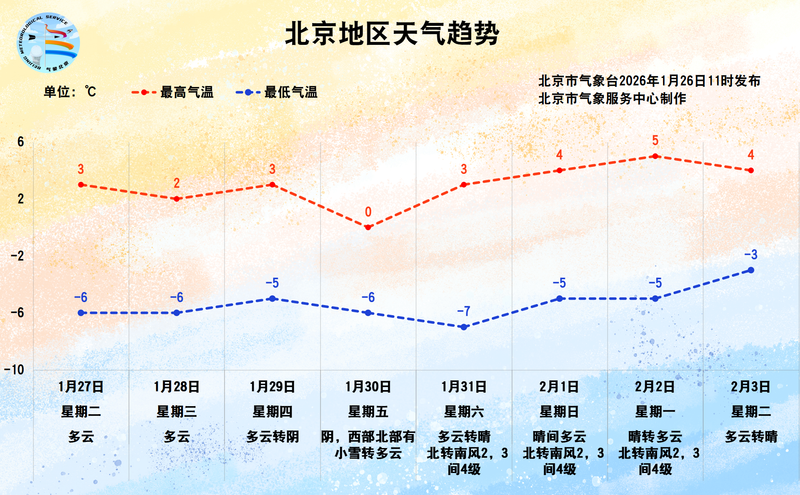 明天北京平原地区最高气温3℃,最低气温-6℃。后天平原地区最高气温2℃,最低气温-6℃。