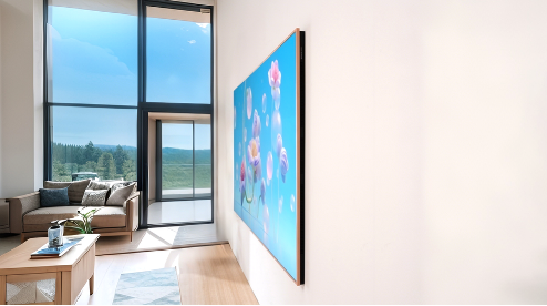 要称A400 Pro为"艺术品",则需要一个与之匹配的外观载体。电视在设计中完美融合了美学与功能性。其浅胡桃木纹画框灵感源于自然木材,色调温润优雅,与大部分现代家装风格兼容。无论是搭配简约风格的白色墙壁,还是与木质家具呼应,A400 Pro都能无缝融入,避免突兀感。这种设计不仅提升了电视的观赏性,还使其在关闭时宛如一幅装饰画,增强空间的艺术气息。