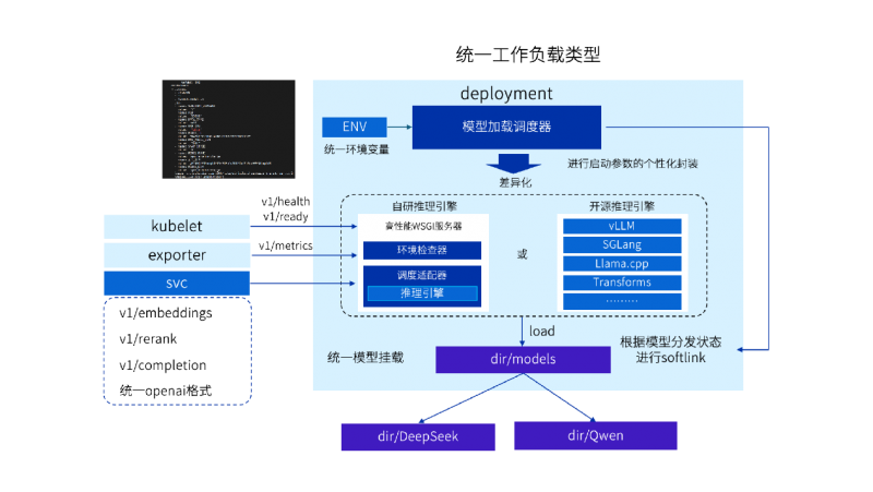 在K8s层面统一封装工作负载接口,自研模型加载调度器作为推理引擎启动的统一入口,提供模型文件分发状态判断、环境变量读取、启动参数配置、本地软链接创建等功能,彻底屏蔽各类推理引擎的参数差异,降低使用门槛。