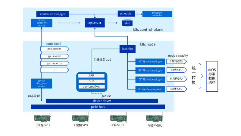 浪潮云海InCloud AIOS基于device-plugin机制构建异构设备扩展框架,向下适配各厂商设备管理模块,向上衔接产品GPU管理功能。