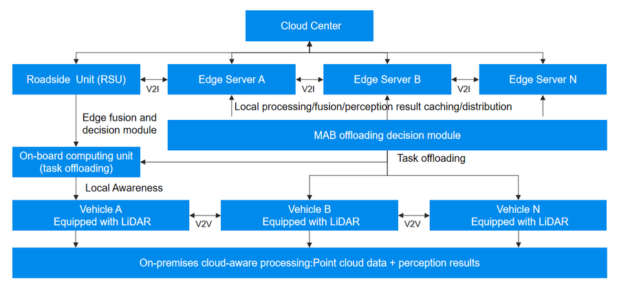另一方面,边缘计算资源(包括车载终端与路侧单元RSU)具备异构的算力与延迟特性。如何在多样化算力与通信环境下平衡本地处理和边缘节点卸载,成为协同感知系统落地的核心难题。目前传统策略往往采用基于经验或规则的卸载方案,缺乏对实时网络状态和异构资源的自适应能力,导致整体性能难以最优。