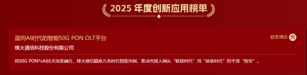 作为行业领军企业,烽火通信科技股份有限公司凭借“面向AI时代的智能50G PON OLT平台”,在C114发起的“2025年度AI+‘硬核’榜单”征集活动中脱颖而出,成功入选创新应用榜单,彰显了其在光通信与AI融合创新方面的卓越实力。