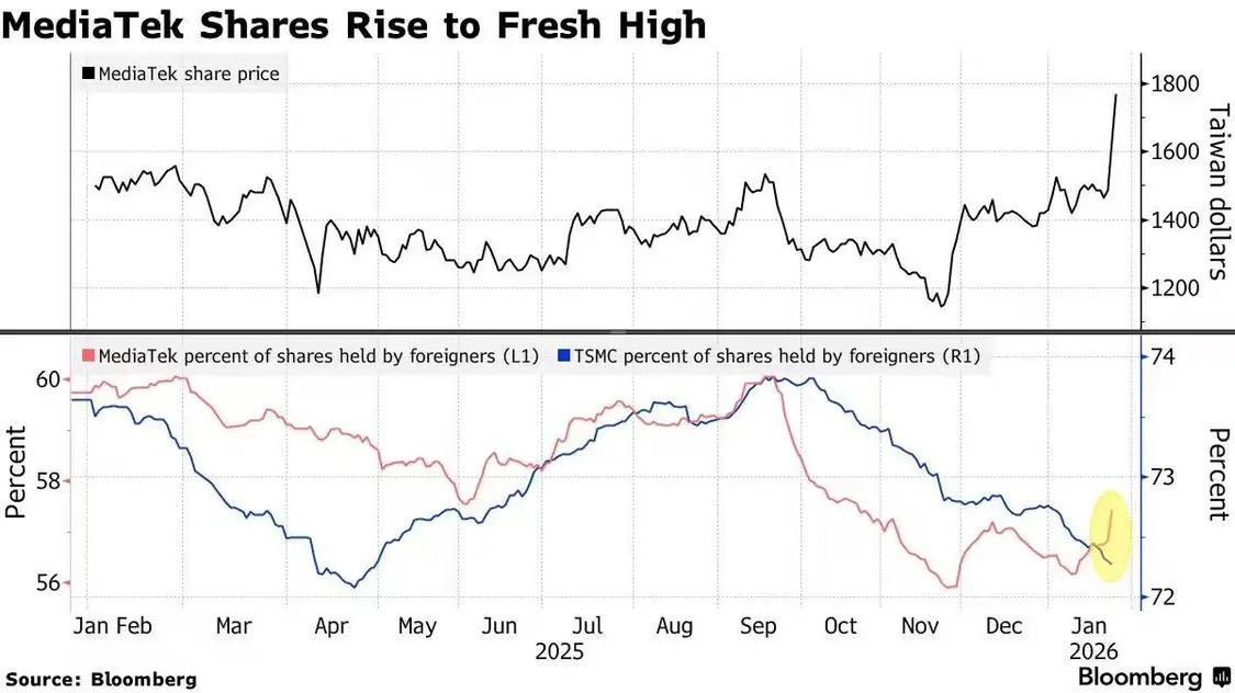 1 月 26 日消息,联发科股价创下了历史最佳两日涨幅纪录,投资者因看好这家芯片设计企业与谷歌的合作关系而纷纷涌入。
