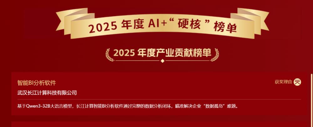 武汉长江计算科技有限公司凭借自主研发的“智能BI分析软件”,以AI技术破解企业“数据孤岛”难题、推动决策智能化,在C114发起的“2025年度AI+‘硬核’榜单”征集活动中成功入选产业贡献榜单,成为AI赋能产业升级的典型代表。