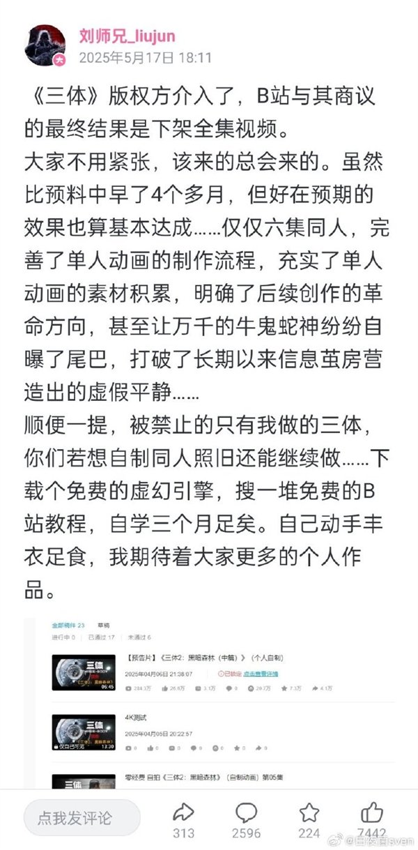 早在去年5月,“刘师兄_liujun”自制的《三体》动画就被突然下架。他当时发文称,《三体》版权方介入了,B站与其商议的最终结果是下架全集视频。