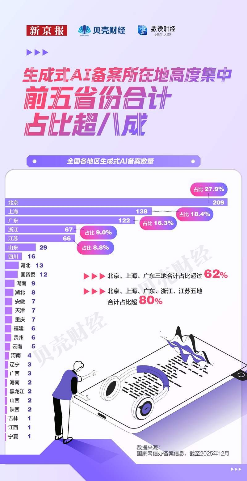 生成式人工智能服务的备案情况,则标志着技术正式进入公共市场与规模化运营阶段。自2024年4月起,国家网信办开始公布生成式人工智能服务的备案信息。截至2025年12月31日,全国共有748款生成式人工智能服务完成备案,其中前五地区合计占比超过80%。其中,北京在模型数量和类型上均表现出较强的多样性,既包括通用大模型,也涵盖面向政务、金融、科研等场景的专业化模型,数量总计209个,占比接近28%。2026年北京两会期间最新数据显示,备案大模型数量已达到212款。