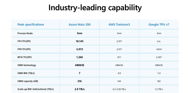 据Scott Guthrie披露,Maia 200在某些性能指标上超越了谷歌和亚马逊的同类芯片。该芯片在FP4精度下的性能是第三代亚马逊Trainium芯片的三倍,FP8性能则超过谷歌第七代TPU。微软已向开发者、学术界和前沿AI实验室开放Maia 200软件开发工具包的预览版,并计划“未来向更多客户开放”该芯片的云服务租用。