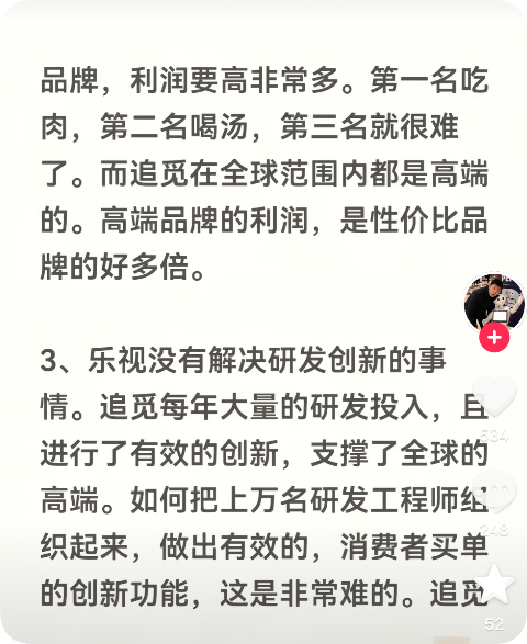 随后,俞浩还指出,乐视在研发创新方面存在不足。而追觅每年进行大量的研发投入,并进行了有效的创新,支撑了其在全球高端市场的地位。