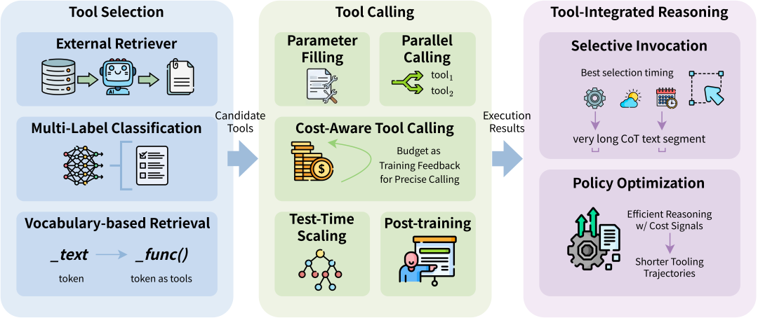工具让智能体从 “会说” 变成 “能做”,但成本也最容易在工具链路里失控。论文按三条主线梳理提效思路:工具选择 — 工具调用 — 工具融合推理。