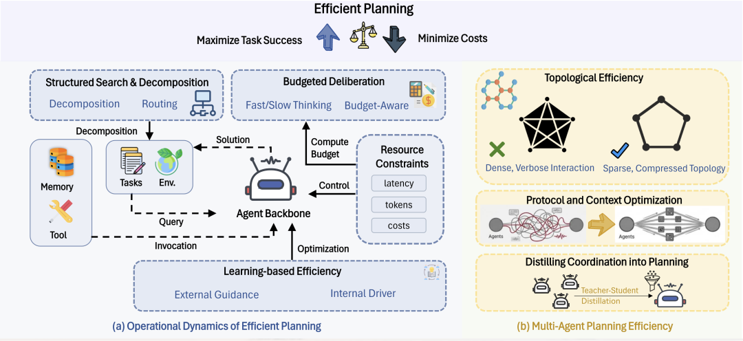 单智能体:少算但不掉效果。主要思路包括自适应预算与控制的 “选择性思考”、结构化搜索的剪枝与代价感知、任务分解的先规划后执行;以及通过策略优化与记忆 / 技能获取把高效规划 “内化或复用”,越用越省。