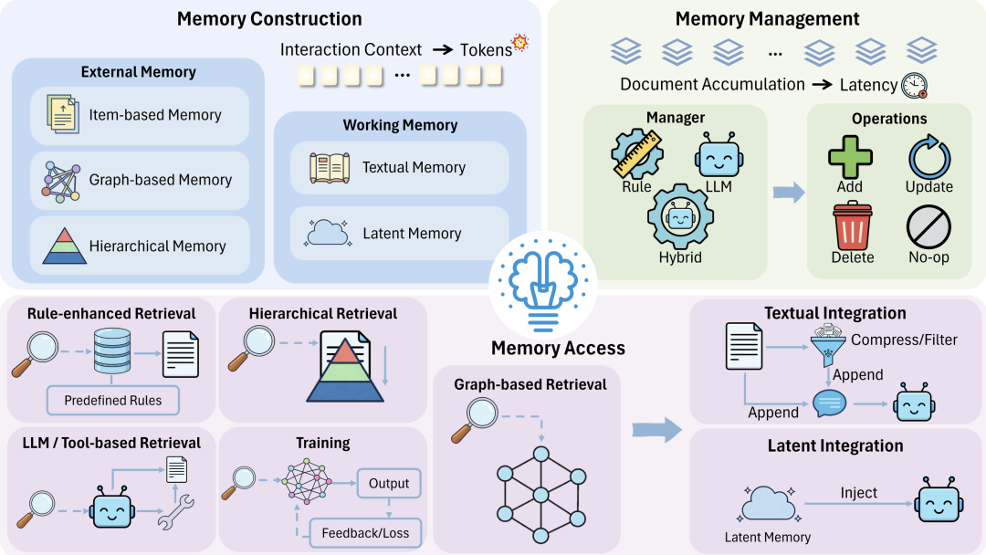 论文按记忆生命周期梳理三步:构建 — 管理 — 访问。